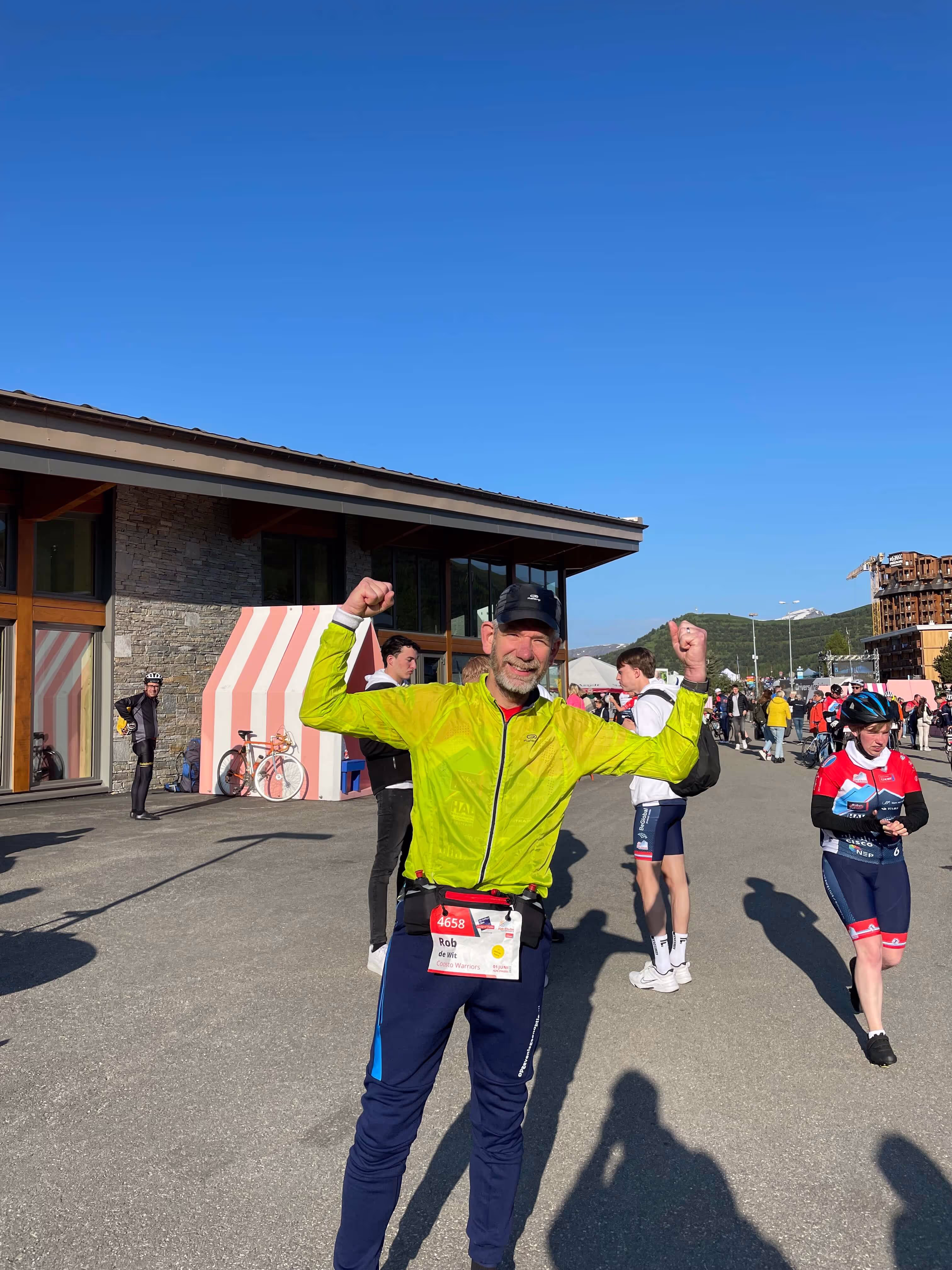At the top of Alpe d'Huez, it is 6°C. So I just bought some long pants here and watched the other finishers. They all crossed the finish line with different emotions. Happy, crying, with pictures of loved ones and some focused only on achievement.